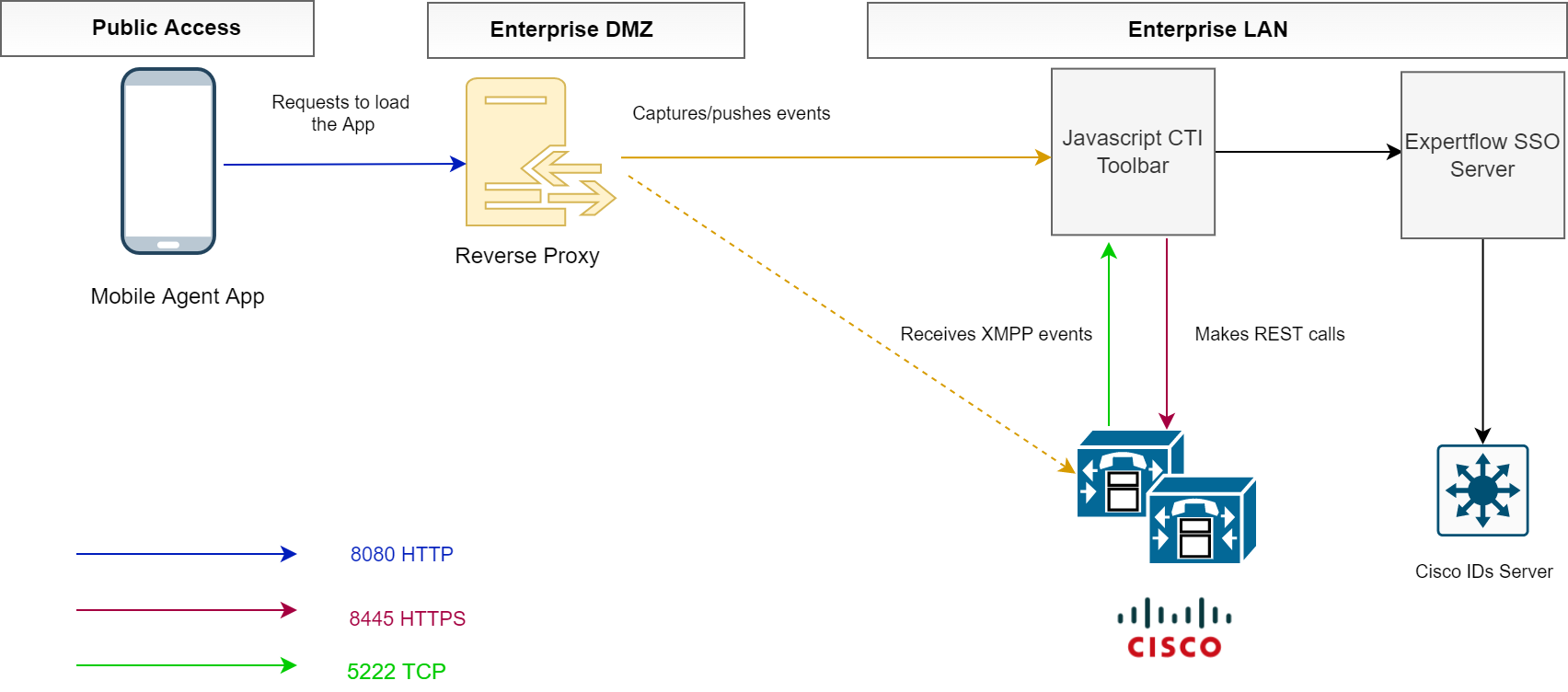 As shown in the picture above, the communication between ExpertFlow Mobile Agent and Cisco Finesse is regulated through Javascript CTI Toolbar. It is preferred to set up a reverse proxy in the Enterprise DMZ that secures the communication between the server components in the LAN and the Mobile app accessible publicly. Once the application is loaded, the DMZ directly routes the traffic to Cisco Finesse