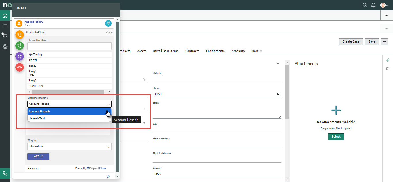 In the case of multiple matches, a list of all the matched records of the respective entity is shown in the drop-down list in alphabetical order. The first record in the list will automatically pop up, however, the agent can also manually select the customer record from the drop-down list and that customer profile will popup.