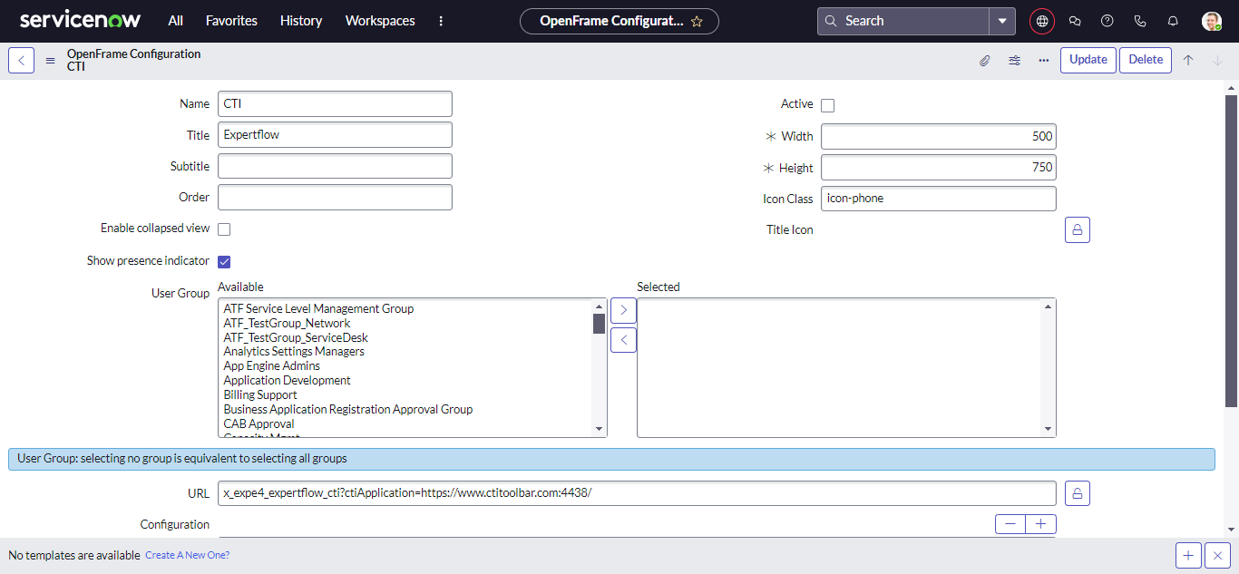 Fill the configuration according to the mentioned configuration.URL represents the CTI installation path. The activate checkbox must be selected. Update and save the form.