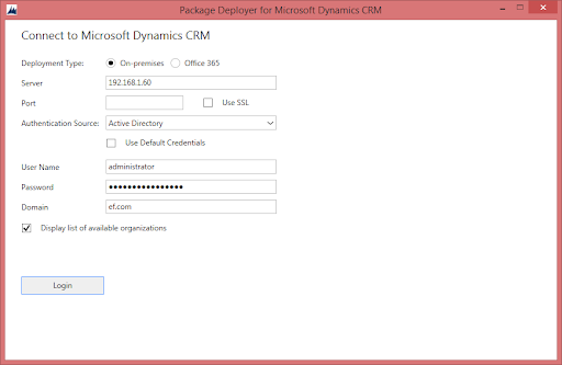 - Select the deployment type On-Premise. Port is optional as it depends how the installation is performedEnter admin account credentials and click Login.