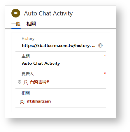 At the end of each chat conversation, a chat activity is automatically created with the information including customer name, agent name, and chat history URL.