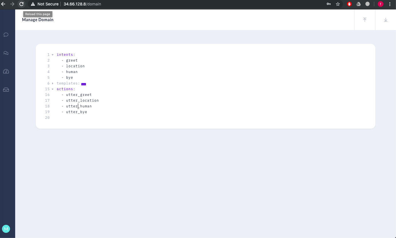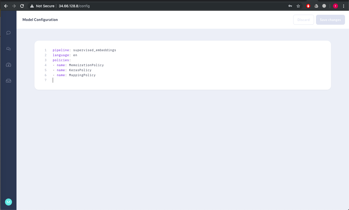 - In the Config Tab, You can add the configuration of your NLU Pipeline, Language and Action Policies as shown below,