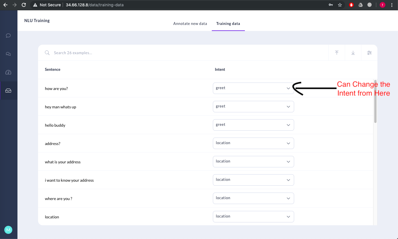 - In NLU Training Tab You can add examples, assign intents and can change the intents of various training examples.