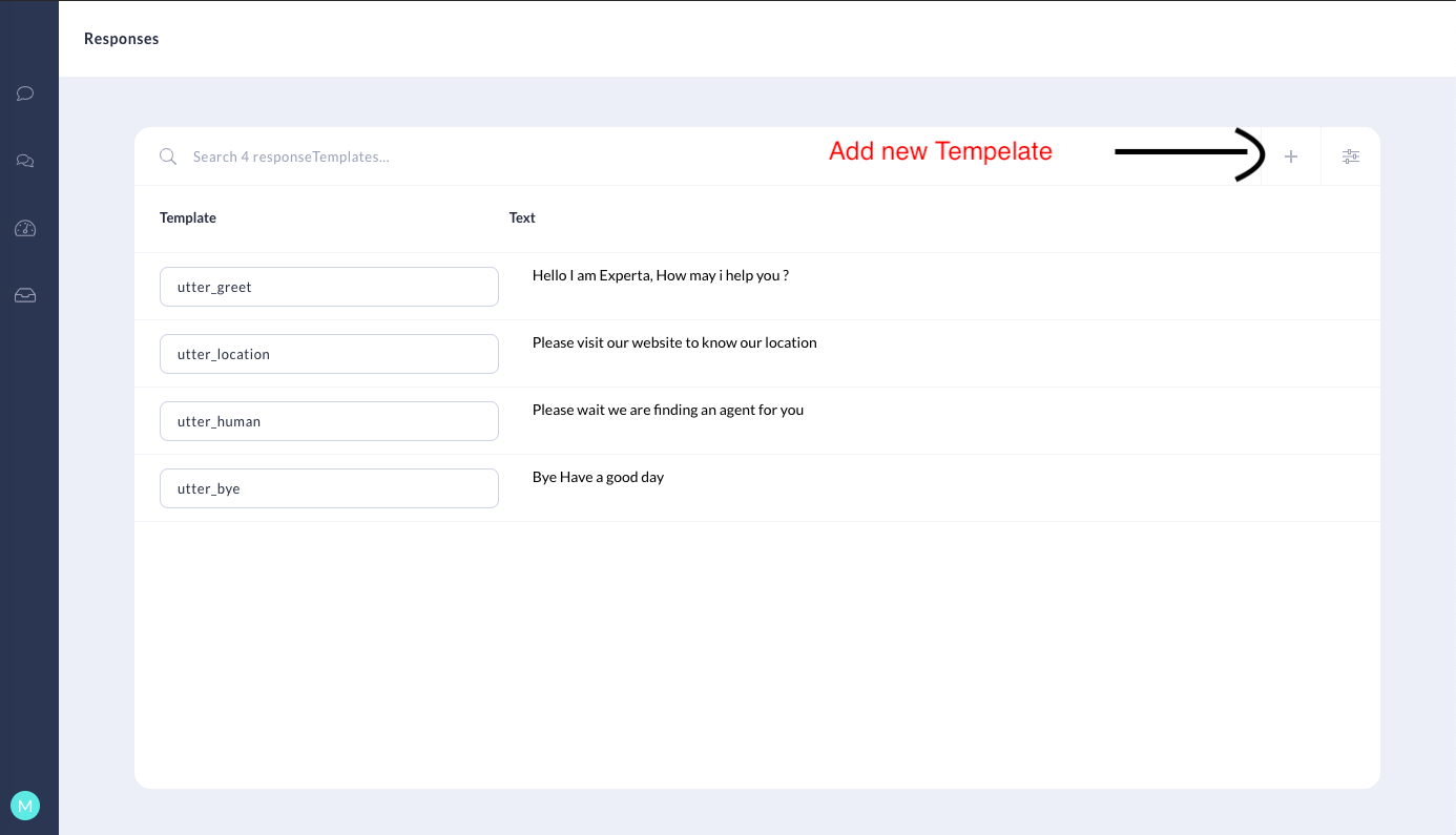 - You can add templates in the responses tab. In order to add a response, you first need to add it in Domain tab with a prefix utter_ (e.g utter_greet).