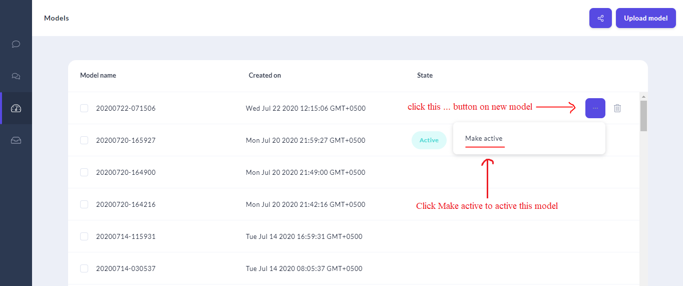 - After the training is complete, you can go to the Models tab. Here you will see the newly trained model. You can mark this as Active.