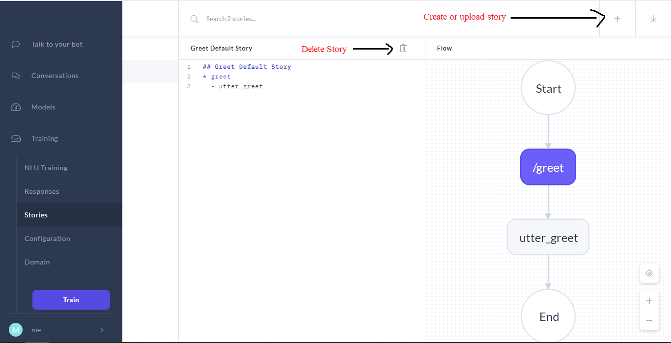 - The following Dashboard will appear after the login in displaying various options to help you train a bot.