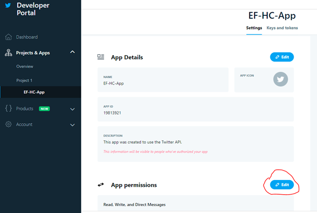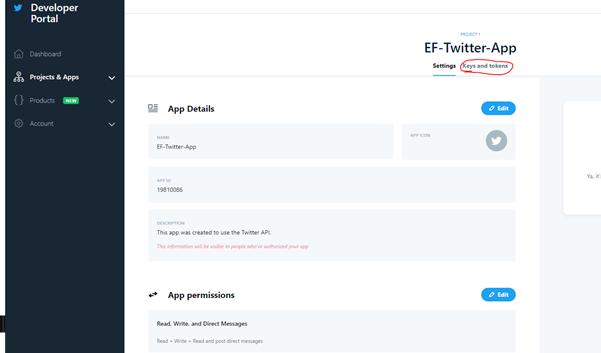 - Create a Project and then create an app. i.e. provide a name for the app, like for example “EF-Twitter-App”.