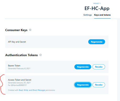 - Generate the Keys and Access Tokens from the “Key and Tokens” Tab as shown in the screenshot below: