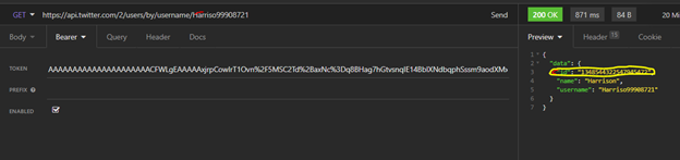 - Paste the Twitter API URL on the address bar: https://api.twitter.com/2/users/by/username/Harriso99908721. The highlighted part is the twitter _username for the account you are integrating, Replace this with the Twitter Account username.