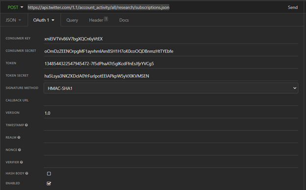 - Paste URL: https://api.twitter.com/1.1/account_activity/all/research/subscriptions.json