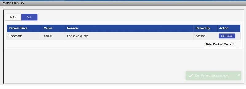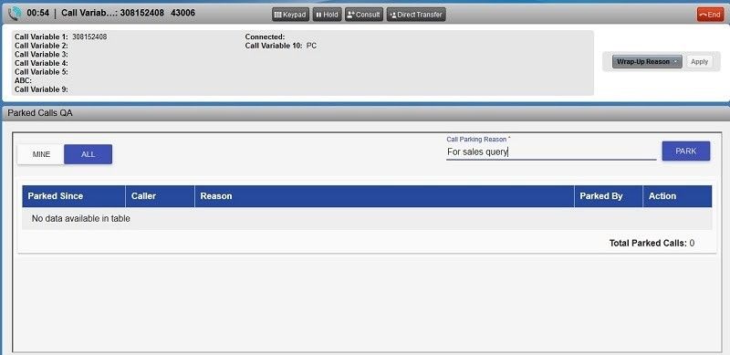 For an active call, the agent will have the option to park the call for a reason. From the list of parked calls, the agent can unpark any call.