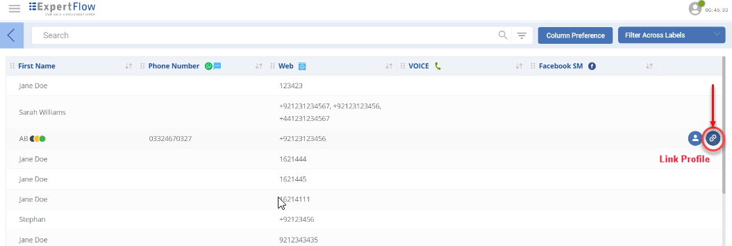 If the agent comes to know that the profile already exists, she can click the Link Profile button under the Customer Profile pane on the right and click the "Link" icon against a desired customer record on the Customer List view as shown below: