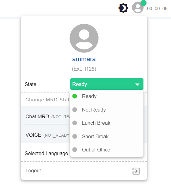 Agents can also see the real-time timer going on to count how much time the agent remains in a state (Ready, Not Ready). This state timer is reset every time the global state is changed.