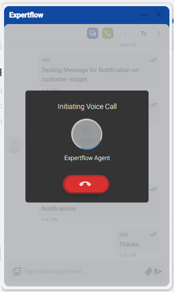 Audio CallA customer can initiate an audio call at any time during an active conversation by clicking on the phone icon visible on the menu bar. Call Operational ActionsDuring an active call, the customer can perform additional actions from the toolbar: