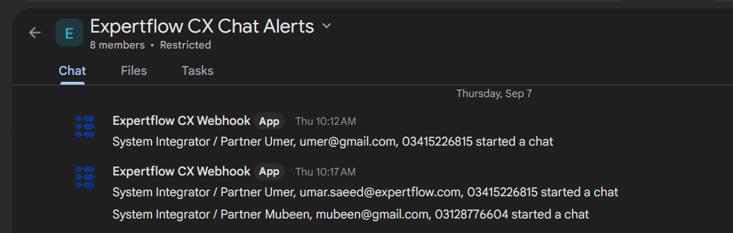 Webhook Notification on Google WorkspaceA Webhook notification on Google Workspace provides agents the flexibility to get notified in their Google spaces/groups of recently initiated web chat sessions. | ![]() |
