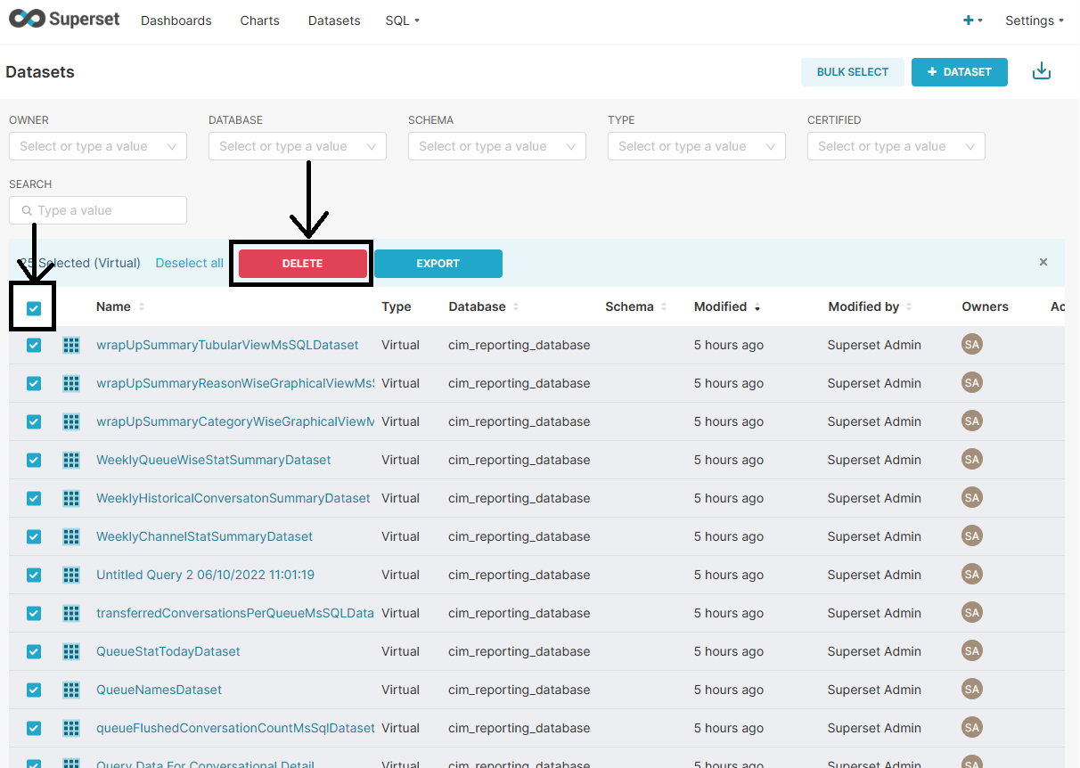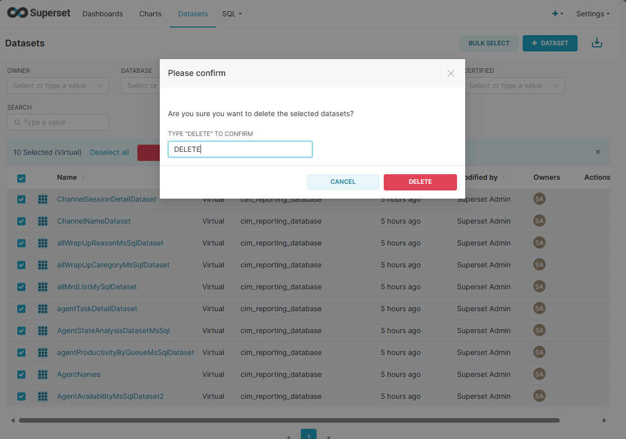This document covers deleting all dashboards, datasets, charts, and database connections from the Apache Superset 2.0 Instance.