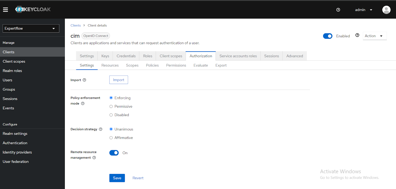 In the ExpertFlow realm, select Clients from the left navigation bar, then click on the cim client.