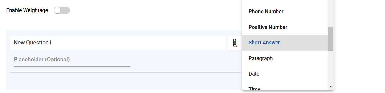 Single-select types (MCQs, dropdowns) can have optional weightage.