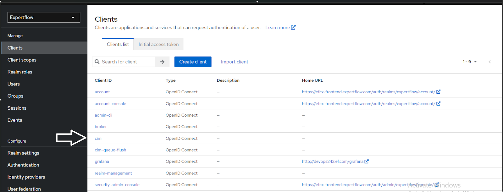 In the ExpertFlow realm, select Clients from the left navigation bar, then click on the cim client.