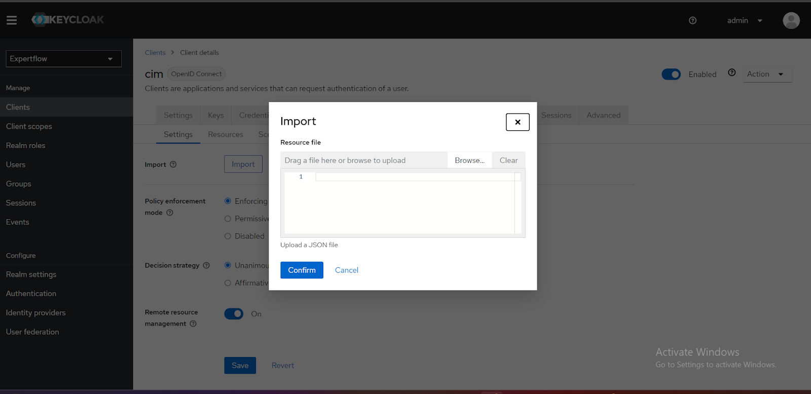 After clicking Import, a popup window will appear. Upload this file campaigns-authz-config-4.10.json which contains all the CX Campaigns related authorization configuration and click Confirm.