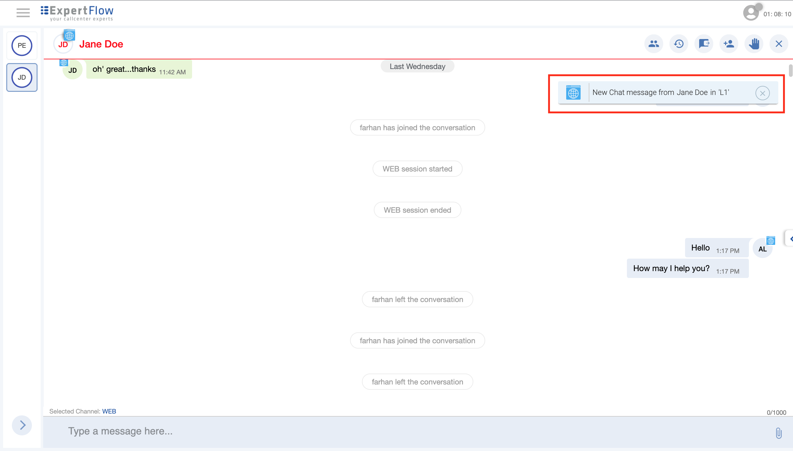Also, in cases of a conferenced/ pull-based chat, the agent can view the notifications whenever a new conversation participant joins/leaves the conversation.