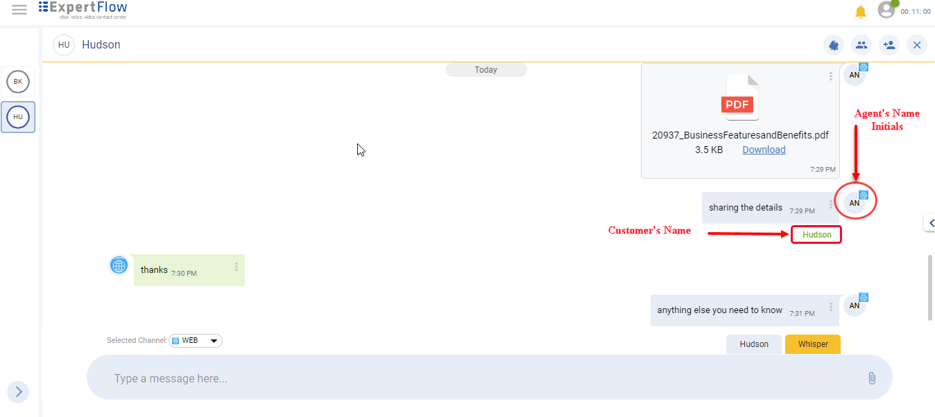 Whisper messaging allows agents to chat internally with another agent or supervisor, during a customer conversation, without letting the customer know.