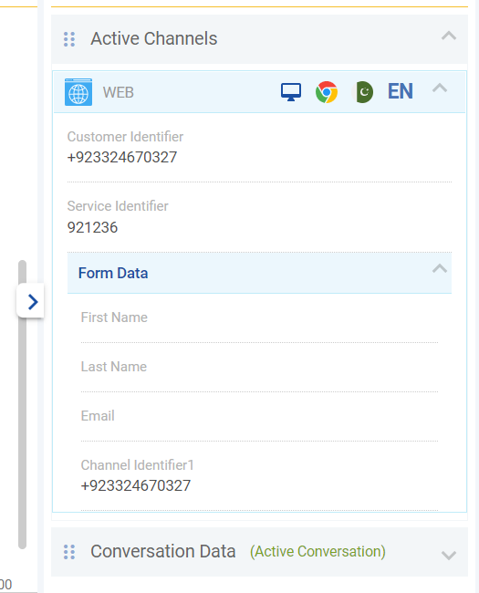 This is where all of the active channel sessions of the customer are listed. These are the channels on which the customer is currently active on the system. Since a customer can open multiple channel sessions in a conversation, all those channel sessions are listed here with or without the channel session data (this is the data that is passed by the channel connector to the channel).