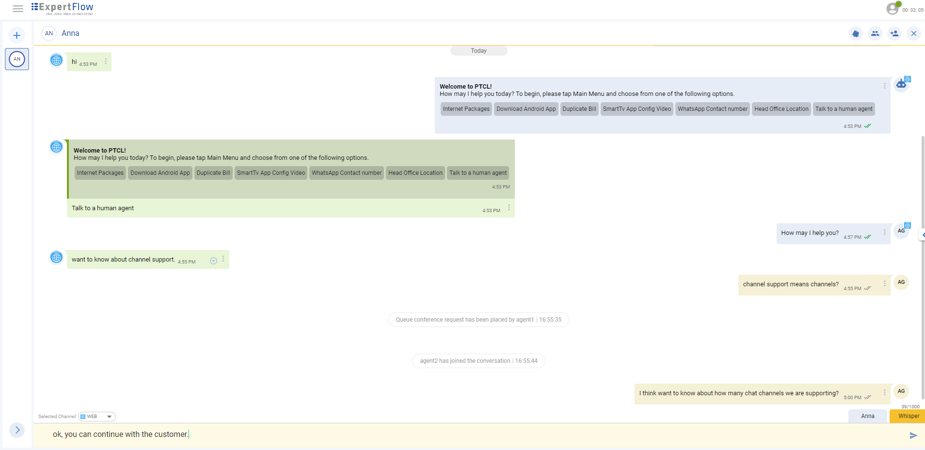 Expertflow CX's Agent Desk is a browser-based application that serves as a unified agent workspace for handling customer queries across all contact center touch points (voice, chat, video). This gives the agents the power to stick to one single interface for handling multiple different nature of customer requests while viewing the combined interaction history across channels, of the incoming customer.