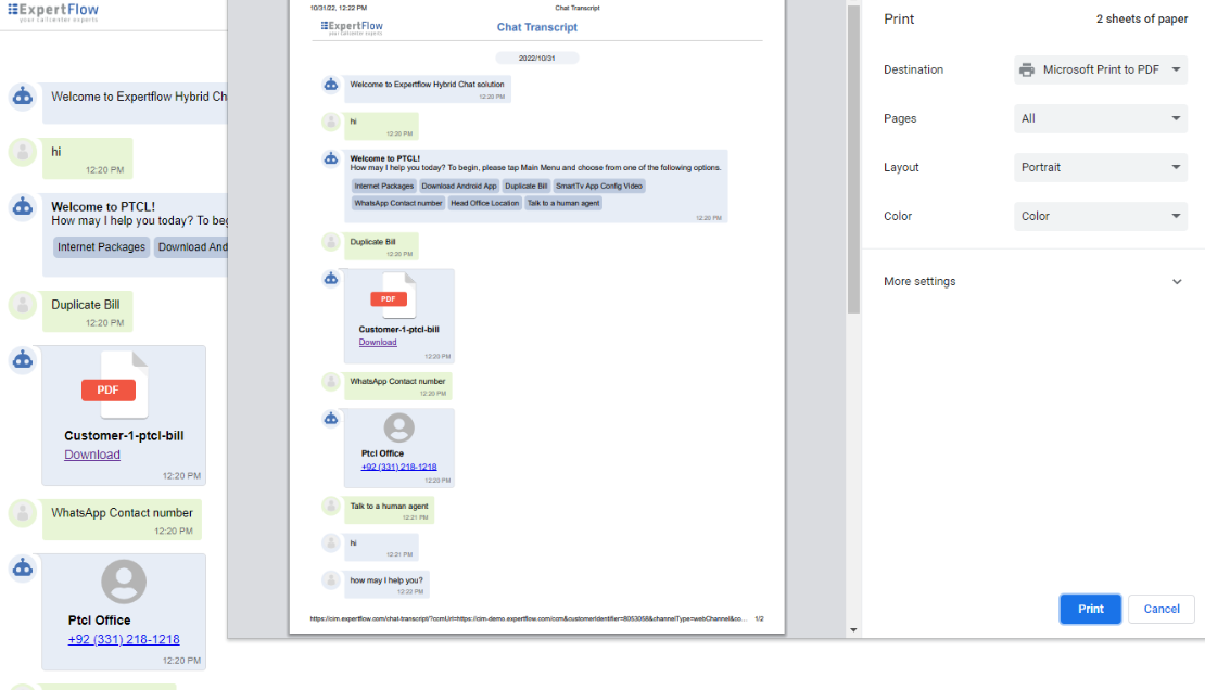 Download Chat Transcript | This feature enables the business to download the full chat transcript at the end of the web chat. Clicking on the Chat Transcript button at the bottom of the widget before Dismiss, allows to view a printable HTML page containing the complete chat record. If the business wants to get print of this, click Print or Cancel otherwise. | ![]() | ||||||||