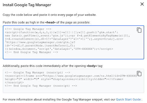- Copy the code and add it to the target website based on the instructions provided. The first code block should be placed in the <head> tag of the target website. This helps to ensure that your Tag Manager configuration is available and ready when the website loads.