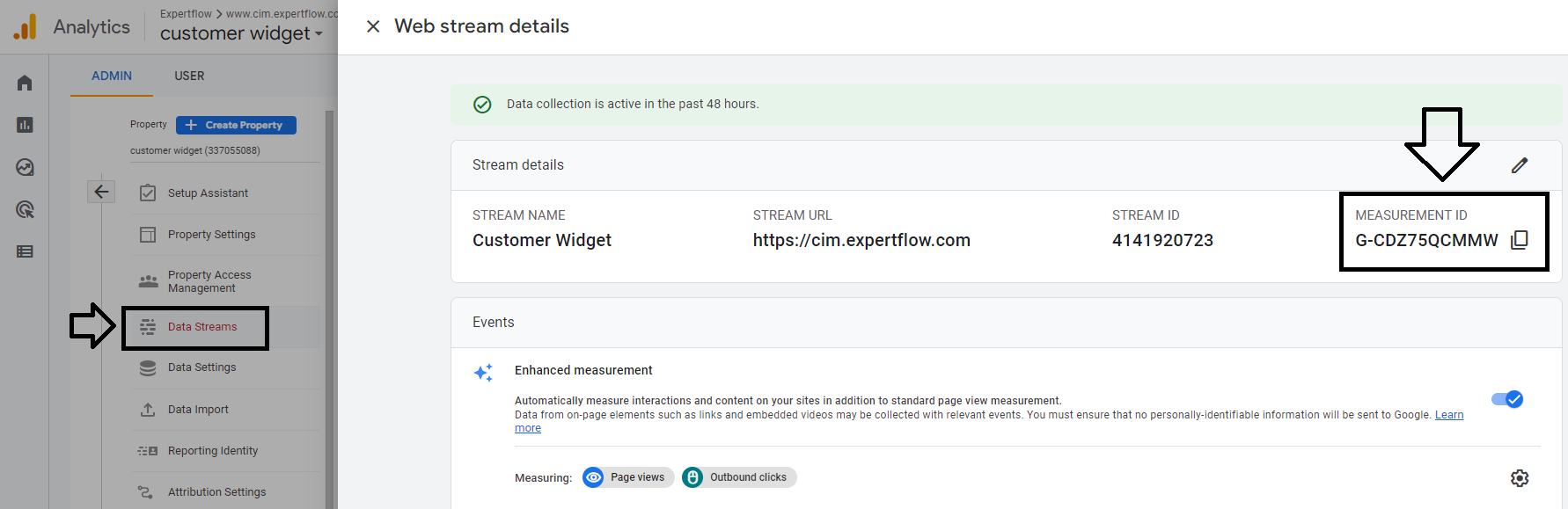 - Navigate to Admin > Account > Property Section > Data Streams and click on the Data Stream Option to get the Measurement ID to embed into the website or GTM Tag.