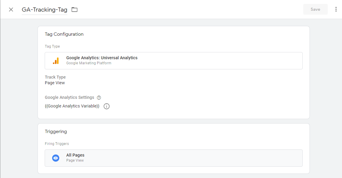 - Create New Tag, Name the tag, select Tag Type "Google Analytics: Universal Analytics", select Track Type as Page View, select GA variable previously created in Google Analytics Settings and fire the tag on Page View Trigger.