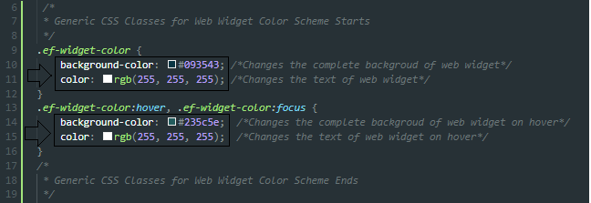 one can change the widget color scheme by updating the values of the background color and color in the style.css file under the ef-widget-color classes.