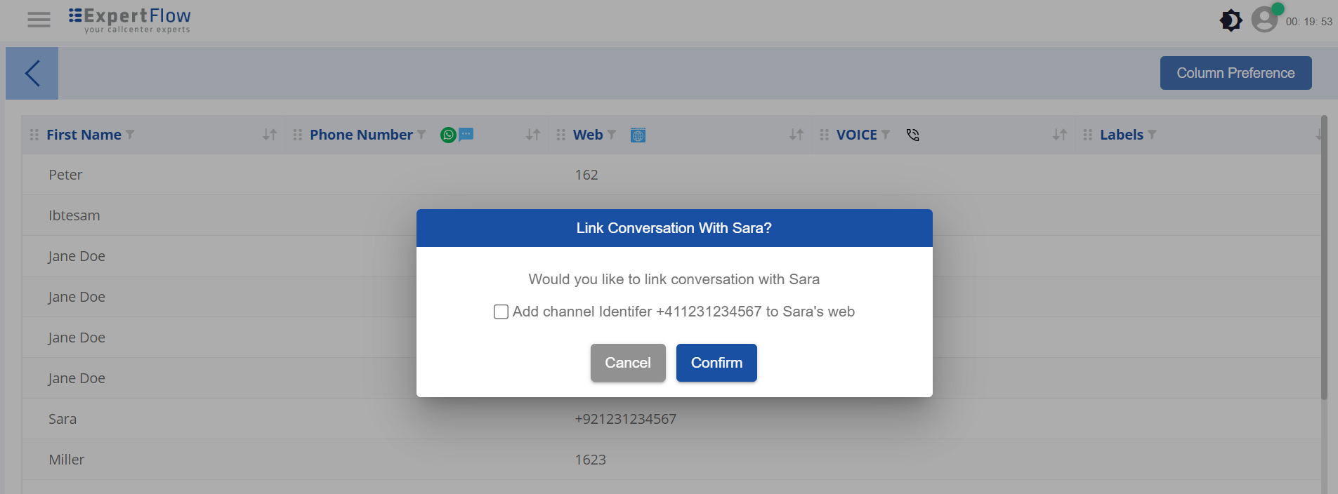 Upon clicking the Link option, the agent is asked to confirm if it also wants to update the channel identity of the customer in the linked profile. Upon confirmation (check the checkbox in the confirmation dialogue), the channel identity is added to the linked profile so that the next time when the customer reaches with the same channel identity, the system will return this customer profile as an identified customer (if no other profile exists with the same identity).