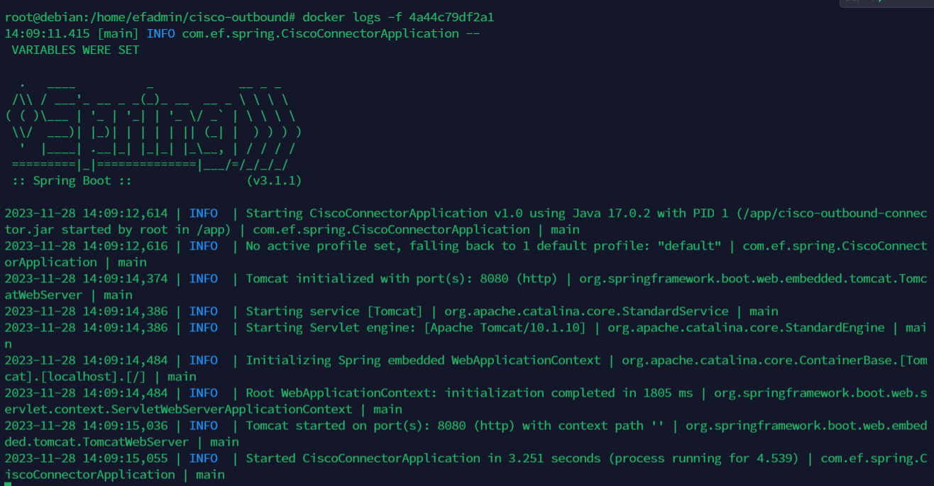 Confirm that the container is running correctly by opening the logs with command docker logs -f containerID.