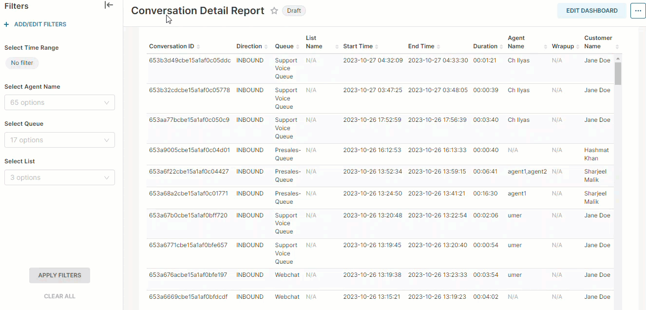 Report Summary | Provides the details of a customer conversation including a conversation's direction, queue name, list name, start time, end time, duration, agent's name, customer's name, routing mode of the conversation, transferred count, percentage of agent/bot participation, transcript, and disposition. |