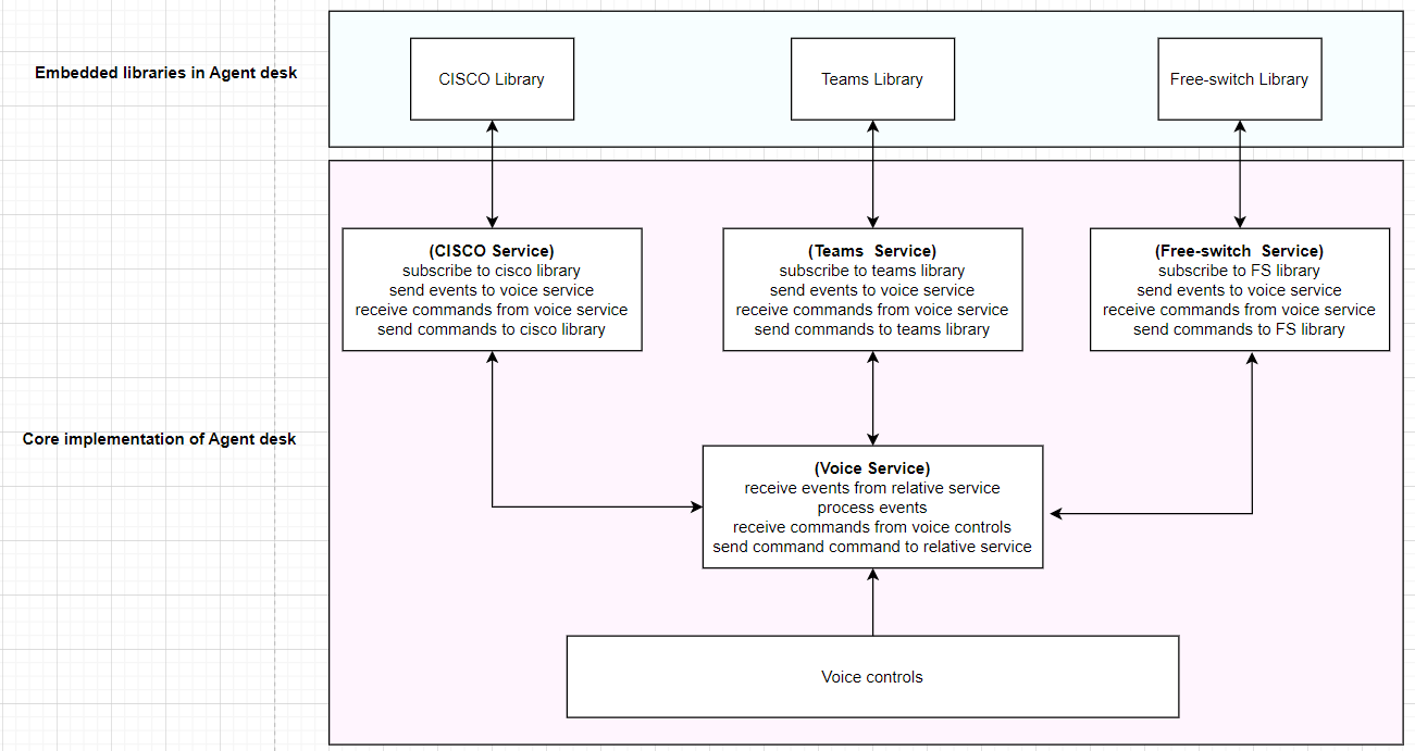 Cisco service, teams service, free-switch, and all the new incoming voice platform services in the future will act as a middleware service that will subscribe and sends and receive commands to the relevant library. All the voice-related implementations will exist in the Voice service which will process all the voice events and contains common functionality, will manage all the voice actions and decisions, so in the future, if we add any new voice platform then we only need to add a middleware service for that platform but the voice service remains the same.
