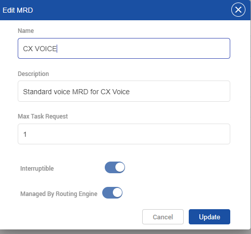 - Set the ManagedByRoutingEngine flag to true for the default CX VOICE MRD.