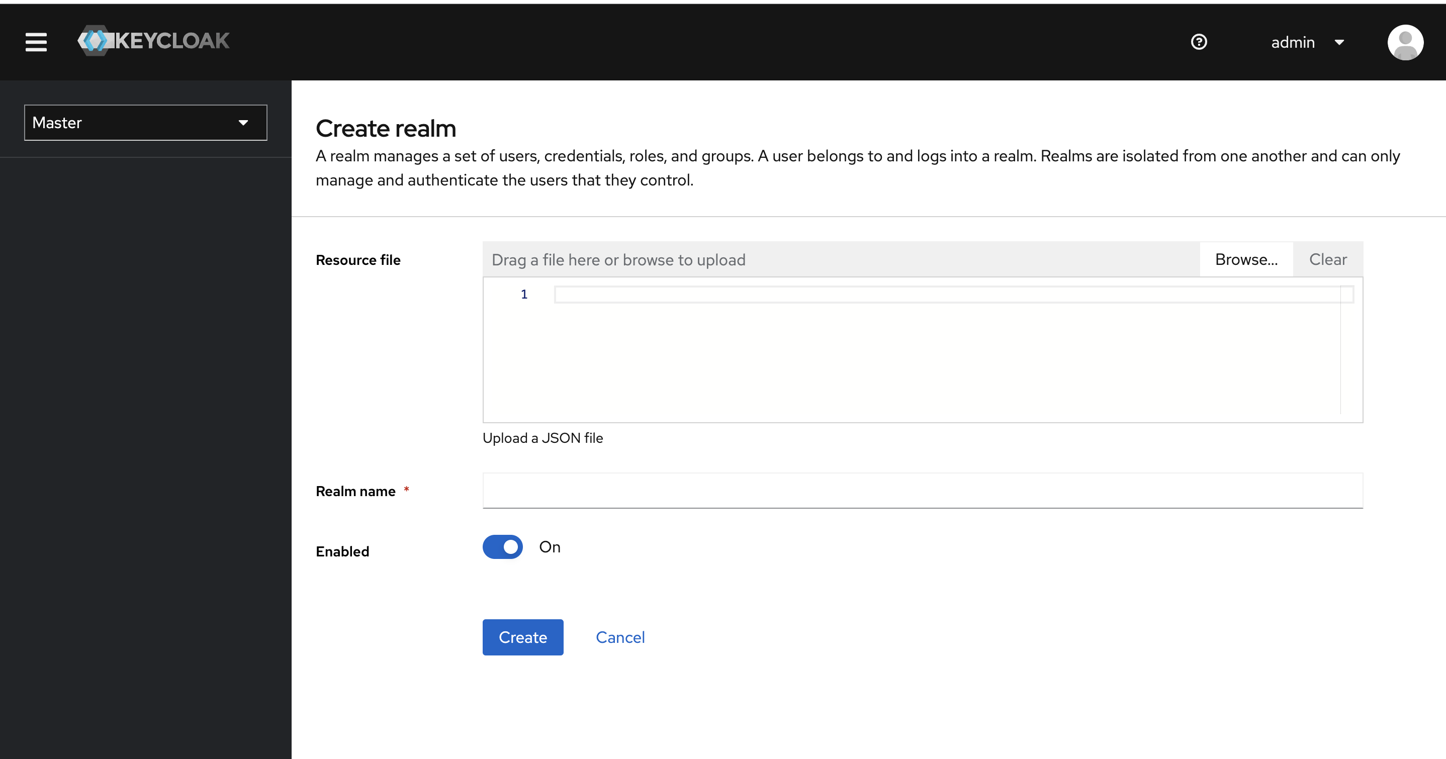 - Bring cursor to master realm and click on Add realm button.