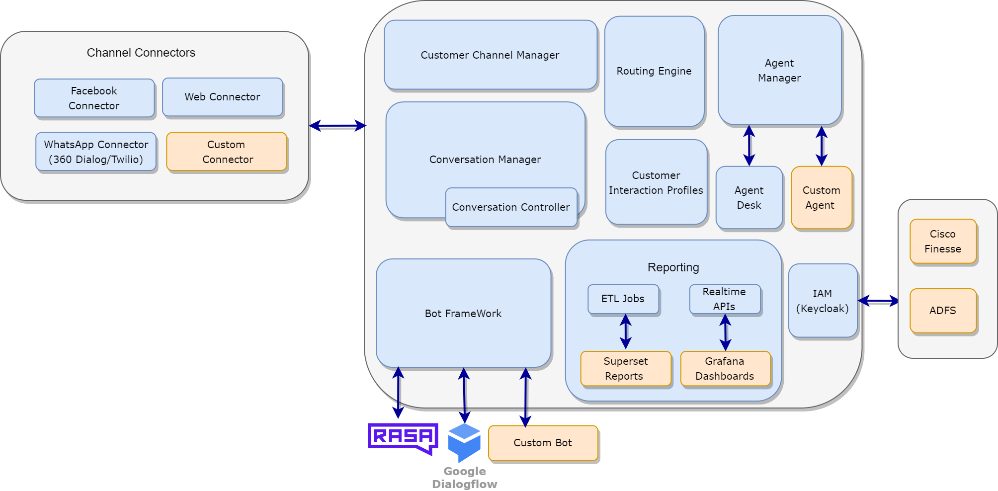 A Channel Connector is a wrapper implementation between a Customer Channel (such as WhatsApp, Facebook, Webchat) and Expertflow CX to exchange customer communication on the channel. Therefore, it is not considered to be a part of the core architecture of the solution.