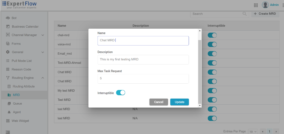 Interruptible | Reserved for future. When available, this will allow us to turn the flag to ON if the requests on this MRD are considered to be interruptible. This means that the system may interrupt the agent on this MRD (during an active conversation) to route him to a conversation from a different MRD if required. |