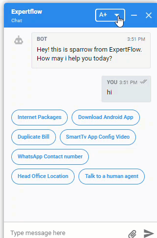 Font Size | The Web Widget supports three font size options such as Large, Medium and Low. Business can use any one of their choice by clicking on the drop-down box at the top of the Web Widget as shown. This feature is enabled by default. To fix the font size, De-activate Font Resize from the unified admin. |