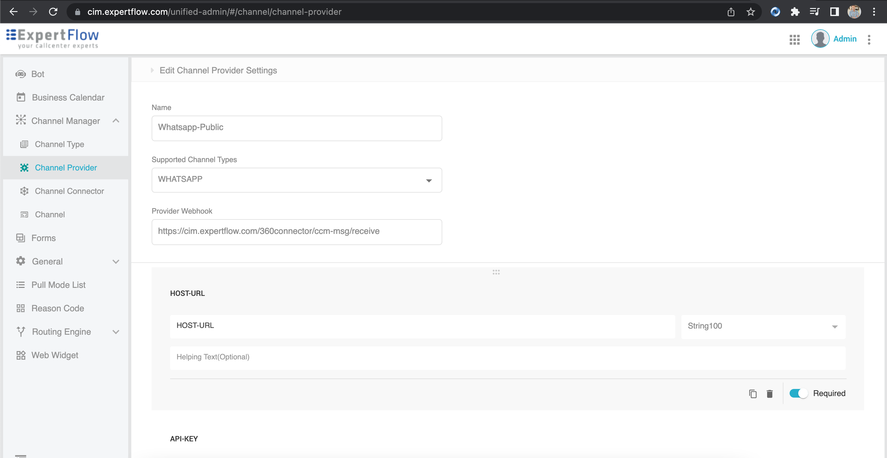 API-KEY | API-KEY contains the token/key for the Channel Provider. | String100 | YES | Q*****************HAK |