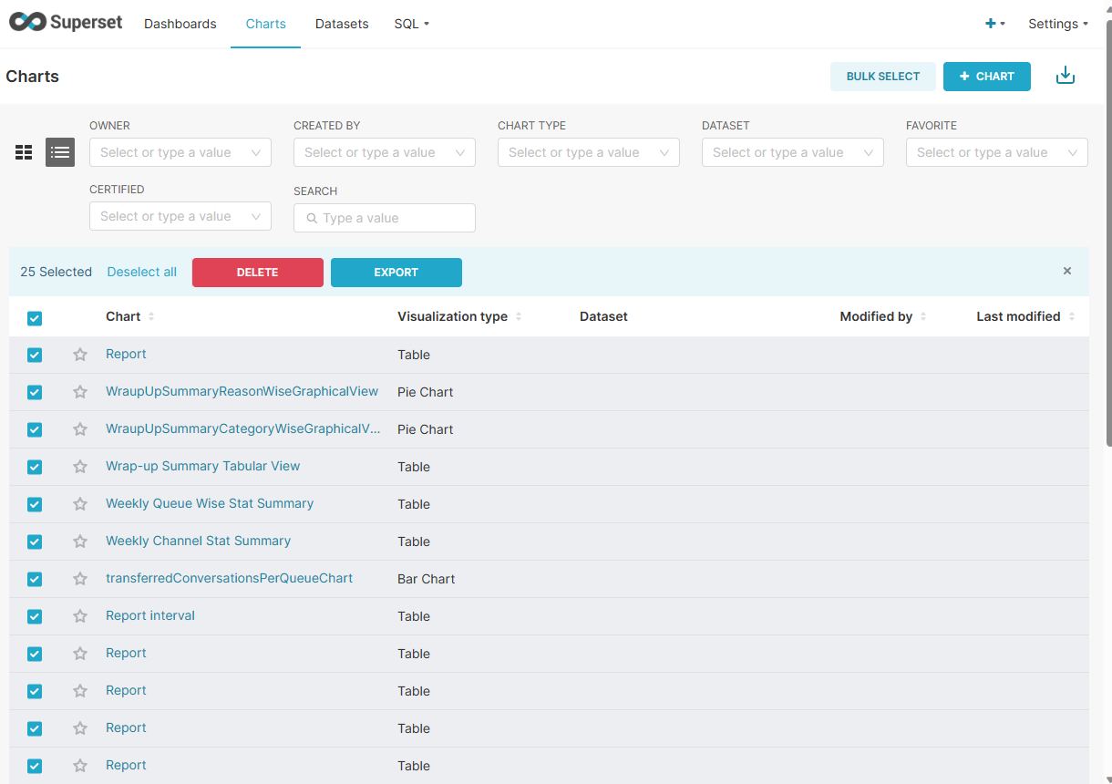 This process will delete all dashboards, datasets, charts, and database connections from Superset. You can now import a new package of all CX reports to Superset.