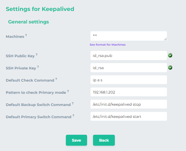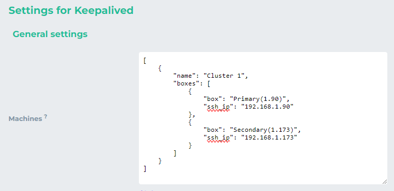 CODE[ { "name": "Virtual IP", "boxes": [ { "box": "Primary", "ssh_ip": "192.168.1.90", "ssh_pubkey": "\/.ssh\/id_rsa.pub", "ssh_key": "\/.ssh\/id_rsa", "check_exec": "ip a s", "check_pattern": "192.168.1.202", "backup_exec": "\/etc\/init.d\/keepalived stop", "primary_exec": "\/etc\/init.d\/keepalived stop" }, { "box": "Secondary", "ssh_ip": "192.168.1.173", "ssh_pubkey": "\/.ssh\/id_rsa.pub", "ssh_key": "\/.ssh\/id_rsa", "check_exec": "ip a s", "check_pattern": "192.168.1.202", "backup_exec": "\/etc\/init.d\/keepalived stop", "primary_exec": "\/etc\/init.d\/keepalived stop" } ] } ]As we are not going to use public key authentication we’ll use the following object for two nodes. The remaining values will be inserted in the boxes. Copy and paste the following lines into machines box