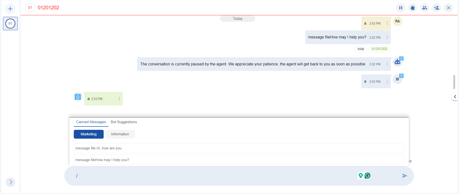 By default, the bot generates suggestions based on the latest message sent by the customer. To view the available  Bot Suggestions, the agent will type '/'  in the composer.