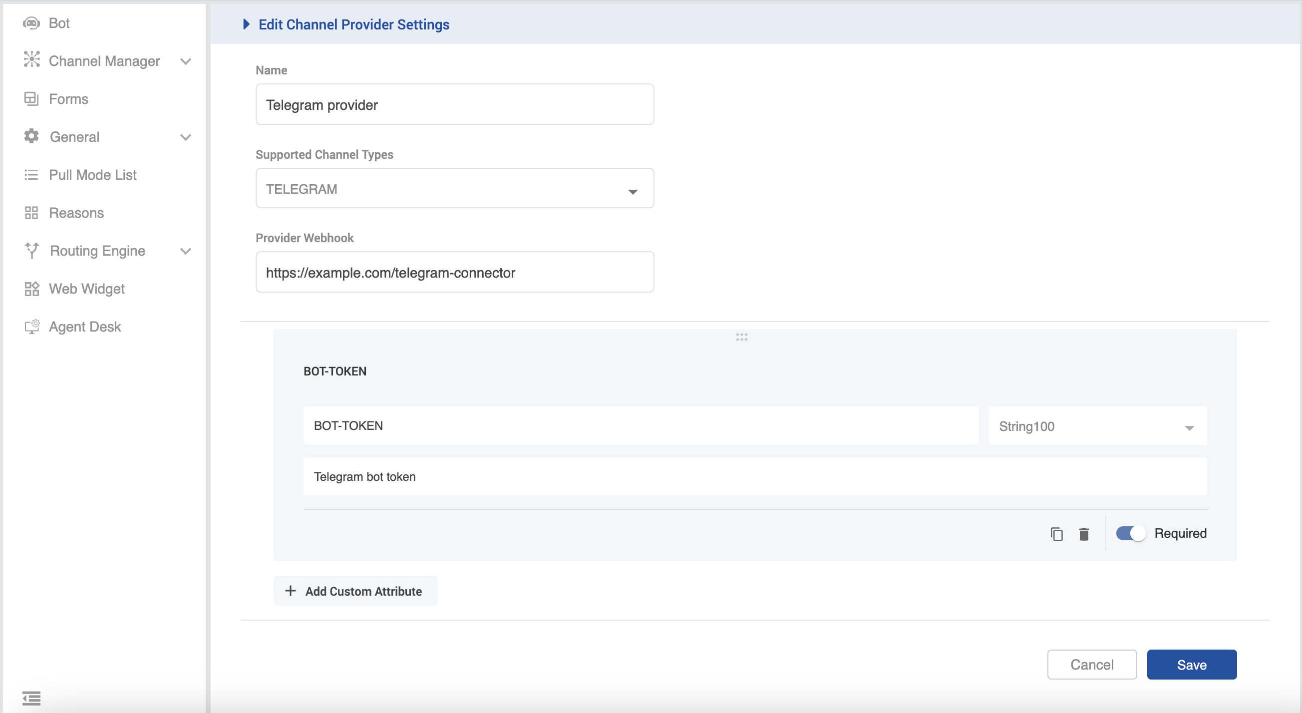 - Once you select the channel provider interface value, then the respective custom attribute fields will appear. These fields will be those which we added in the previous step as part of custom attributes.