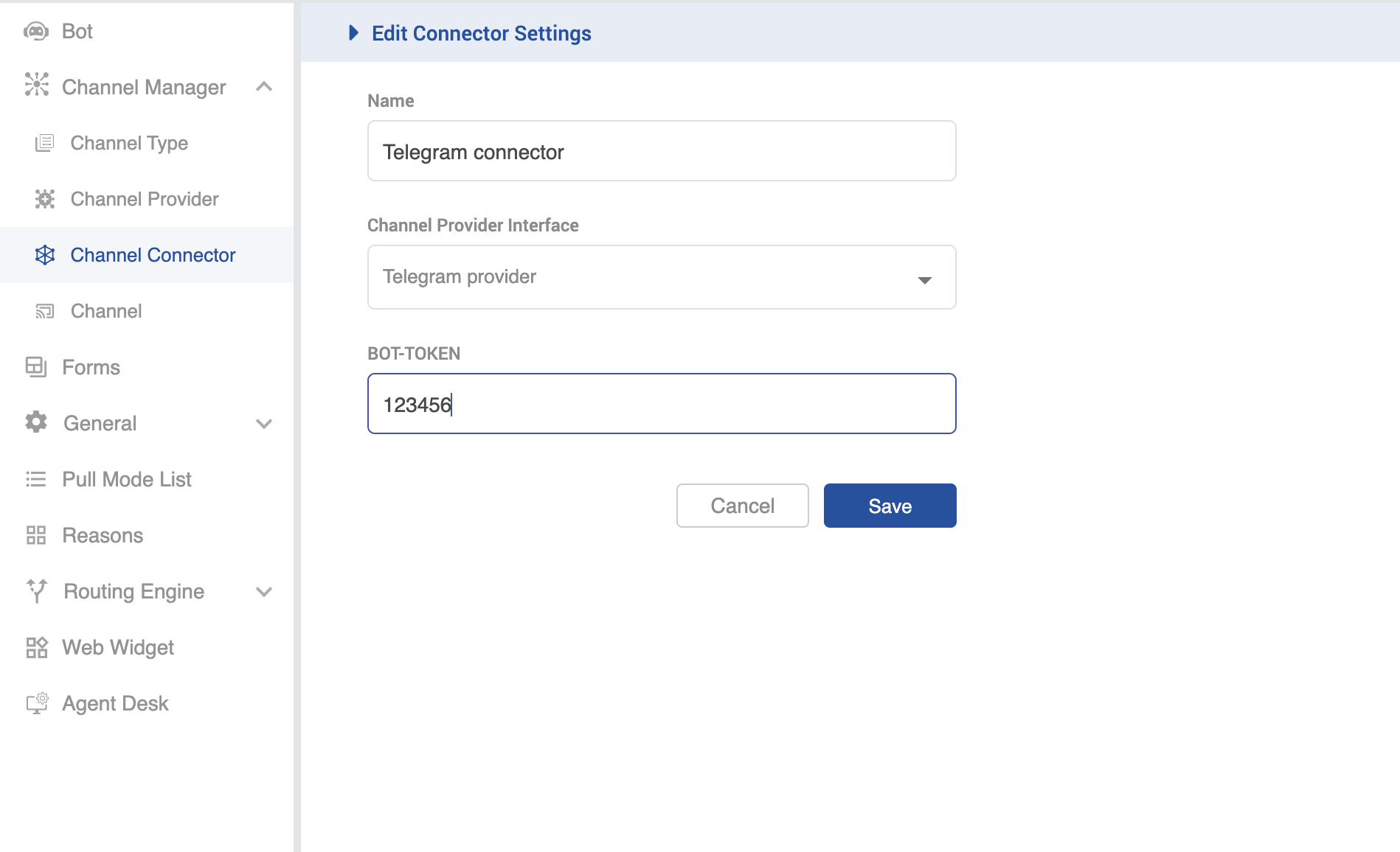 - Add a new Channel Connector. Name can be eg. Telegram Channel Connector.