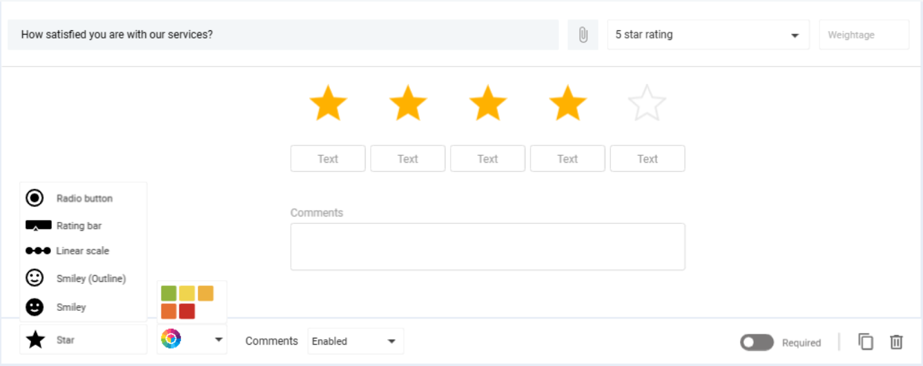 The CX form builder is developed keeping in mind a wide range of different form requirements for different use cases, including, but not limited to pre-conversation forms, post-post conversation surveys, quality management questionnaires, conversation wrapups, login forms, etc. The form builder provides a wide range of questions types/ attributes with validation checks e.g. text fields with variable lengths, MCQs, Alpha Numeric, Yes/ No, Email, IP, Number, Password, Phone Number, Positive Number, URL, File upload (Attachments), Date and time, Time, 5-star rating, NPS (Net Promoter Score), etc. These questions can be grouped into sections in combination with weightage calculations for QM forms. Additionally, the form builder allows for attaching an audio prompt to a question to be played back in case of IVR. The upcoming versions of the form builder will include form versioning, multiple languages, and sub-categories for wrapups.