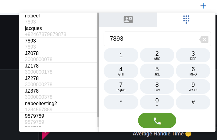 Agents can initiate contact with a customer by clicking the '+' icon at the top. This will drop a panel carrying two options, to dial a number, or choose a customer to be contacted from the customer list.
